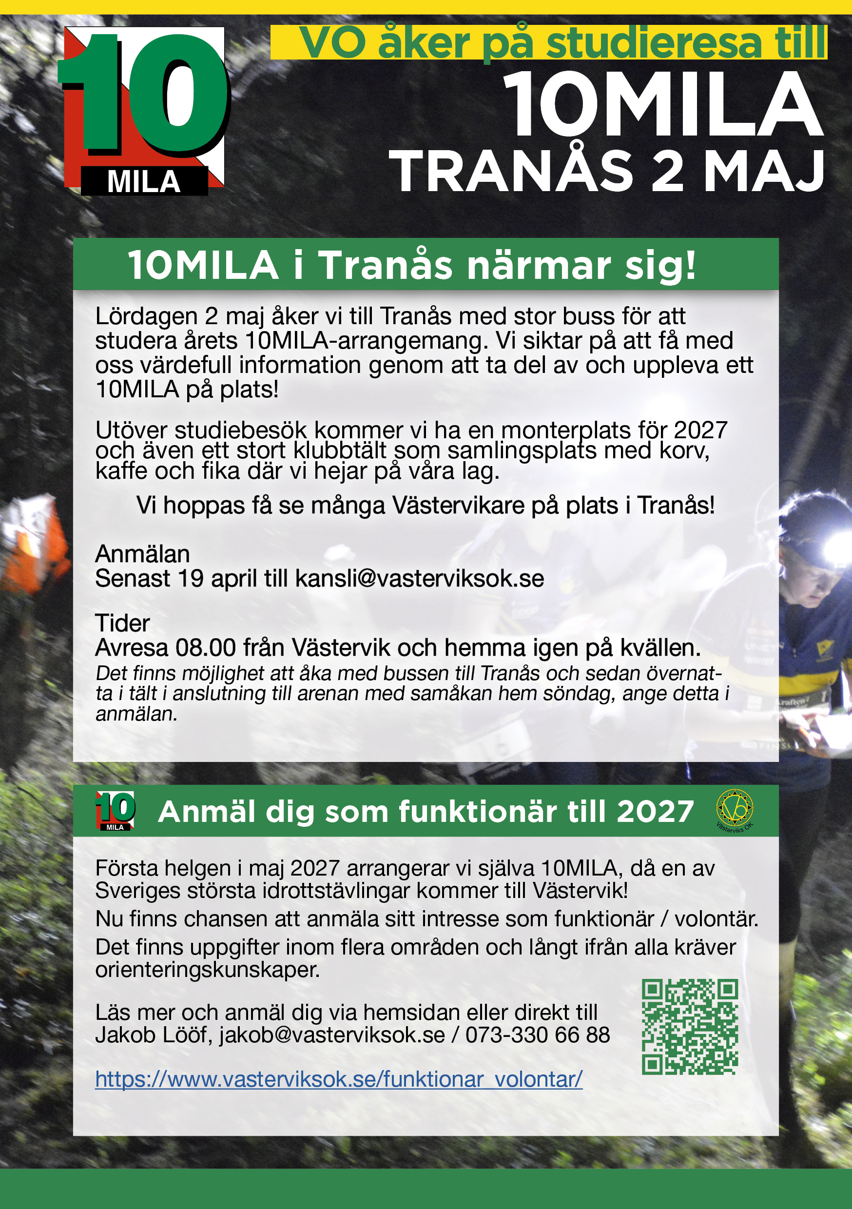 12 april 2026Kom ihåg 1: Betala medlemsavgiften för 2026, läs mer här: Medlemsavgift Västerviks OK 2026 Kom ihåg 2: Läs mer och anmäl dig som funktionär/volontär inför 10MILA: Funktionärer och Volontärer till 10MILA i Västervik 2027 – Västerviks [...]